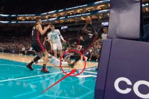 这不看回放?三球用手扒阿德巴约脚后跟致其倒地受伤 已回更衣室