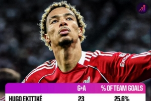 体育资讯4月15日讯 埃基蒂克疑似跟腱受伤将长期缺战,这对利物浦攻击力无疑是巨大打击。OPTA盘点了本赛季利物浦队内各项赛事参与进球(进球+助攻)情况,具体如下(参与进球+队内占比)
