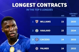 当前最长合同榜:尼科2035、哈兰德2034,凯塞多等蓝军6人到2033