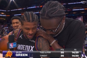 上一场附加赛,杰伦·格林出战39分钟,29中14、三分7中2空砍35分5板2助,两场附加赛轰下71分!