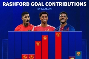 体育资讯4月15日讯 巴萨将在本轮欧冠再战马竞,拉什福德的表现将至关重要,《转会市场》统计显示拉什福德本赛季直接参与进球数已可排在生涯第4位。